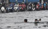 REPUBLIKA.CO.ID, BEKASI -- Dua anak bermain di genangan air di Jalan Sultan Agung, Bekasi, Jawa Barat, Senin (1/4/2024). Sistem drainase yang buruk di kawasan tersebut menyebabkan genangan air dengan ketinggian 10 cm-30 cm usai hujan sehingga menimbulkan kemacetan lalu lintas.