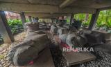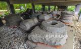 Pengunjung melihat koleksi temuan benda purbakala yang diterlantarkan di bawah bangunan berkonstruksi panggung di Kawasan Candi Kedaton, Kawasan Cagar Budaya Nasional (KCBN) Muara Jambi, Muaro Jambi, Jambi, Senin (1/4/2024). Belasan benda purbakala di antaranya beberapa arca, makara, dan padmasana peninggalan peradaban Candi Muara Jambi yang sebelumnya disimpan di ruang museum setempat kini terlantar di bawah bangunan panggung tanpa penutup selama hampir dua tahun. (FOTO : ANTARA FOTO/Wahdi Septiawan)