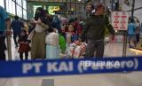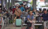 Sejumlah pemudik menunggu kedatangan kereta api di Stasiun Pasar Senen, Jakarta, Senin (1/4/2024). Hari ini sejumlah penumpang mulai memadati Stasiun Pasar Senen, untuk menuju ke kampung halaman dalam menyambut Idulfitri. Walaupun mulai padat, namun situasi masih kondusif. Sejumlah calon penumpang memilih mudik lebih awal untuk menghindari kepadatan jelang Lebaran Idul Fitri 1445 H. Presiden Joko Widodo mengimbau masyarakat untuk mudik Lebaran tahun ini lebih awal, Diperkirakan akan terjadi peningkatan jumlah pemudik dengan total sekitar 190 juta orang atau meningkat 56 persen dibandingkan tahun sebelumnya. (FOTO : Republika/Prayogi)
