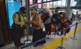Petugas mengecek tiket pemudik sebelum memasuki peron kereta api di Stasiun Pasar Senen, Jakarta, Senin (1/4/2024). Hari ini sejumlah penumpang mulai memadati Stasiun Pasar Senen, untuk menuju ke kampung halaman dalam menyambut Idulfitri. Walaupun mulai padat, namun situasi masih kondusif. Sejumlah calon penumpang memilih mudik lebih awal untuk menghindari kepadatan jelang Lebaran Idul Fitri 1445 H. Presiden Joko Widodo mengimbau masyarakat untuk mudik Lebaran tahun ini lebih awal, Diperkirakan akan terjadi peningkatan jumlah pemudik dengan total sekitar 190 juta orang atau meningkat 56 persen dibandingkan tahun sebelumnya. (FOTO : Republika/Prayogi)