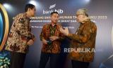 Direktur Utama (Dirut) Bank BJB Yuddy Renaldi (kanan) berbincang dengan Pj Gubernur Jawa Barat (Jabar) dan Komisaris Utama Independen Ventje Rahardjo (kiri) usai Rapat Umum Pemegang Saham Tahunan Tahun Buku 2023 di The Trans Luxury Hotel, Kota Bandung, Jawa Barat, Selasa (2/4/2024). Dirut Bank BJB mengatakan, Bank BJB mencatatkan kinerja keuangan terjaga baik sepanjang tahun 2023. Berdasarkan laporan keuangan yang dipublikasikan, sepanjang 2023 Bank BJB mencatatkan laba sebesar Rp2,14 Triliun dengan Non Performing Loan (NPL) alias rasio kredit macet yang terjaga dengan baik pada level 1,35%. (FOTO : Edi Yusuf/Republika)