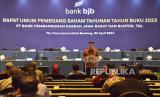 Para pejabat daerah, dan para pemegang saham hadir saat Rapat Umum Pemegang saham Tahunan Tahun Buku 2023 di The Trans Luxury Hotel, Kota Bandung, Jawa Barat (Jabar), Selasa (2/4/2024). Dirut Bank BJB mengatakan, Bank BJB mencatatkan kinerja keuangan terjaga baik sepanjang tahun 2023. Berdasarkan laporan keuangan yang dipublikasikan, sepanjang 2023 Bank BJB mencatatkan laba sebesar Rp2,14 Triliun dengan Non Performing Loan (NPL) alias rasio kredit macet yang terjaga dengan baik pada level 1,35%. (FOTO : Edi Yusuf/Republika)