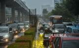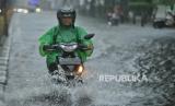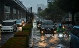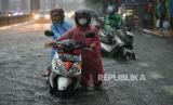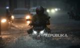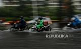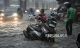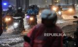 Pengendara menerobos genangan air yang menutupi ruas jalan H.R Rasuna Said, Jakarta, Rabu (3/4/2024). Genangan tersebut disebabkan oleh intensitas hujan yang tinggi serta aliran drainase yang meluap sehingga menyebabkam lalu lintas tersendat. (FOTO : Republika/Thoudy Badai)