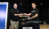 Head of Cards and Loan UOB Indonesia Herman Soesetyo (kanan) menyerahkan kunci mobil MINI PS Bespoke Edition kepada Victor Indrawan (kiri) selaku pemenang Lucky Draw yang merupakan loyalty programme UOB, saat acara Talkshow dan Pengumuman Pemenang di Plaza MINI, Jakarta, Rabu (3/4/2024). (FOTO : Dok Republika)