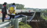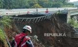 REPUBLIKA.CO.ID, SUKABUMI -- Petugas memeriksa kondisi jalan tol yang ambles di ruas tol Bocimi KM 64, Sukabumi, Jawa Barat, Kamis (4/4/2024). Jalan tol Bocimi KM 64 yang ambles pada Rabu (3/4) malam, mengakibatkan satu mobil dan dua orang terperosok. Selain itu, arus lalu lintas dari Jakarta menuju Sukabumi kemudian dialihkan ke pintu keluar tol Cigombong.