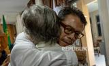 Aktivis lingkungan Karimunjawa Daniel Frits Maurits Tangkilisan (kanan) memeluk ibunya Marjorie Tangkilisan (kiri) seusai sidang vonis kasus UU ITE terkait unggahan media sosial tentang pencemaran limbah tambak udang Karimunjawa di Pengadilan Negeri Jepara, Jawa Tengah, Kamis (4/4/2024). Majelis hakim PN Jepara memvonis  Daniel dengan hukuman 7 bulan penjara dan denda Rp5 juta subsider 1 bulan kurungan penjara karena menilai Daniel melanggar Pasal 28 ayat (2) Undang-Undang No. 19 Tahun 2016 tentang Perubahan Atas Undang-Undang No. 11 Tahun 2008 tentang Informasi dan Transaksi Elektronik (UU ITE), sementara itu pihak kuasa hukum Daniel akan mengajukan banding atas vonis tersebut.  (FOTO : ANTARA FOTO/Aji Styawan)