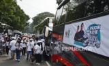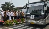 Pj Gubernur Jawa Barat Bey Macmudin berserta pejabat terkait melepas program mudik gratis bertajuk Mudik Asyik Bersama BUMN 2024 di depan Gedung Sate, Jalan Diponegoro Kota Bandung, Jawa Barat, Jumat (5/4/2024). Industri Pertahanan Defend ID kembali mengadakan mudik gratis bersama Kementerian Badan Usaha Milik Negara (BUMN), kali ini menyediakan lima rute perjalanan yaitu Surabaya, Solo, Yogyakarta, Semarang, dan Palembang. (FOTO : Edi Yusuf/Republika)