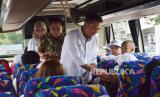 Pj Gubernur Jawa Barat Bey Macmudin berserta pejabat terkait berbincang dengan penumpang peserta mudik program mudik gratis bertajuk Mudik Asyik Bersama BUMN 2024 di depan Gedung Sate, Jalan Diponegoro Kota Bandung, Jawa Barat, Jumat (5/4/2024). Industri Pertahanan Defend ID kembali mengadakan mudik gratis bersama Kementerian Badan Usaha Milik Negara (BUMN), kali ini menyediakan lima rute perjalanan yaitu Surabaya, Solo, Yogyakarta, Semarang, dan Palembang. (FOTO : Edi Yusuf/Republika)