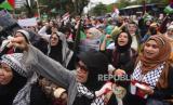 Massa yang tergabung dalam Barisan Aliansi Resistensi Al-Aqsha (BARAQ) menggelar aksi solidaritas mendukung Palestina pada peringatan Hari Al-Quds Internasional di depan Kedubes AS, di Jakarta, Jumat (5/4/2024). Dalam aksinya mereka menilai genosida yang dilakukan terhadap bangsa Palestina oleh Israel dan AS bertentangan dengan nilai-nilai kemanusiaan dan mengapresiasi langkah diplomatik yang ditempuh pemerintah Indonesia dalam mendukung dan mengupayakan kemerdekaan bangsa Palestina. (FOTO : ANTARA FOTO/Indrianto Eko Suwarso)
