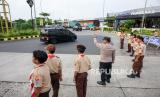 Anggota pramuka didampingi polisi mengatur lalu lintas di Rest Area Tol 379 A, Batang, Jawa Tengah, Jumat (5/4/2024). Selain polisi, sejumlah relawan dari beberapa unsur seperti Pramuka, PMI, dan Dinas Kesehatan ikut membantu kelancaran lalu lintas di rest area tol Kabupaten Batang pada arus mudik lebaran 2024. (FOTO : ANTARA FOTO/Harviyan Perdana Putra)