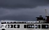 Kapal ferry yang ditumpangi pemudik berlayar di bawah awan hitam yang menggelayut di Pelabuhan Merak, Banten, Sabtu (6/4/2024). Empat hari jelang perayaan Idul Fitri 1445 Hijriah, Pelabuhan Merak mulai ramai didatangi pemudik yang akan menyeberang ke Pelabuhan Bakauheni, Lampung. Diprediksikan puncak arus mudik di Pelabuhan Merak akan terjadi hingga Ahad (7/4/2024). (FOTO : Republika/Putra M. Akbar)