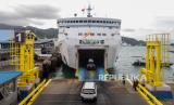 Sejumlah mobil pemudik menaiki kapal ferry di Pelabuhan Merak, Banten, Sabtu (6/4/2024). Empat hari jelang perayaan Idul Fitri 1445 Hijriah, Pelabuhan Merak mulai ramai didatangi pemudik yang akan menyeberang ke Pelabuhan Bakauheni, Lampung. Diprediksikan puncak arus mudik di Pelabuhan Merak akan terjadi hingga Ahad (7/4/2024). (FOTO : Republika/Putra M. Akbar)
