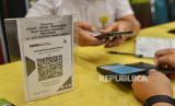 Jamaah membayar zakat fitrah melalui layanan Qris di Masjid Istiqlal, Jakarta, Sabtu (6/4/2024). Unit Pengumpul Zakat (UPZ) Baznas Masjid Istiqlal membuka layanan pembayaran zakat fitrah berupa 3,5 liter beras atau uang senilai Rp50.000 yang berlangsung hingga malam takbiran. (FOTO : Republika/Thoudy Badai)