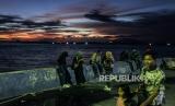Sejumlah pemudik menunggu waktu keberangkatan kapal Ferry di Pelabuhan Merak, Cilegon, Banten, Sabtu (6/4/2024). Penjualan tiket kapal Ferry hingga 8 April 2024 sudah habis terjual pada puncak arus mudik Lebaran 2024. (FOTO : Republika/Putra M. Akbar)