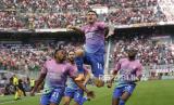 AC Milan Christian Pulisic, teratas, merayakan bersama rekan satu timnya setelah mencetak gol pembuka timnya pada pertandingan sepak bola Serie A antara AC Milan dan Lecce di stadion San Siro, di Milan, Italia, Sabtu, (6/4/2024). (FOTO : AP Photo/Antonio Calanni)