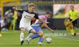 Pontus Almqvist dari Lecce, kiri, berebut bola dengan Filippo Terracciano dari AC Milan saat pertandingan sepak bola Serie A antara AC Milan dan Lecce di stadion San Siro, di Milan, Italia, (6/4/2024). (FOTO : AP Photo/Antonio Calanni)