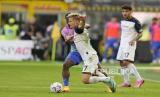Christian Pulisic dari AC Milan, latar belakang kiri, mencetak gol pembuka timnya saat pertandingan sepak bola Serie A antara AC Milan dan Lecce di stadion San Siro, di Milan, Italia, (6/4/2024). (FOTO : AP Photo/Antonio Calanni)