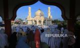Jamaah Tarekat Syattariyah bersiap melaksanakan shalat Idul Fitri 1445 Hijriah di halaman Masjid Syaikhuna Habib Muda Seunagan Desa Peuleukung, Seunagan Timur, Nagan Raya, Aceh, Senin (8/4/2024). Sebagian umat Islam di Kabupaten Nagan Raya dan Kabupaten Aceh Barat melaksanakan shalat Idul Fitri 1445 Hijriah lebih awal dari jadwal yang ditetapkan pemerintah karena didasarkan pada metode hisab urfi khumasi atau bilangan lima dalam kitab Tajul Muluk yang dianut jamaah Syattariyah. (FOTO : ANTARA FOTO/Syifa Yulinnas)