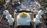 Foto udara Jamaah Tarekat Syattariyah melaksanakan shalat Idul Fitri 1445 Hijriah di halaman Masjid Syaikhuna Habib Muda Seunagan Desa Peuleukung, Seunagan Timur, Nagan Raya, Aceh, Senin (8/4/2024). Sebagian umat Islam di Kabupaten Nagan Raya dan Kabupaten Aceh Barat melaksanakan shalat Idul Fitri 1445 Hijriah lebih awal dari jadwal yang ditetapkan pemerintah karena didasarkan pada metode hisab urfi khumasi atau bilangan lima dalam kitab Tajul Muluk yang dianut jamaah Syattariyah. (FOTO : ANTARA FOTO/Syifa Yulinnas)