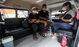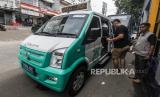 Warga saat menaiki angkot listrik di Halte Cidangiang, Kota Bogor, Jawa Barat, Senin (8/4/2024). Pemerintah Kota Bogor melakukan uji coba lima unit angkot listrik Bogor (Alibo) dengan 30 titik pemberhentian yang menggunakan sistem pembayaran nontunai dengan tarif Rp5 ribu untuk sekali perjalanan. (FOTO : Republika/Putra M. Akbar)