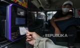 Warga melakukan pembayaran elektronik saat akan menaiki angkot listrik di Halte Cidangiang, Kota Bogor, Jawa Barat, Senin (8/4/2024). Pemerintah Kota Bogor melakukan uji coba lima unit angkot listrik Bogor (Alibo) dengan 30 titik pemberhentian yang menggunakan sistem pembayaran nontunai dengan tarif Rp5 ribu untuk sekali perjalanan. (FOTO : Republika/Putra M. Akbar)