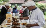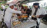 Jamaah Tarekat Naqsabandiyah Al Kholidiyah Jalaliyah menyantap ketupat usai melaksanakan sholat Idul Fitri di Masjid Rumah Suluk Darussalam, Cigombong, Kabupaten Bogor, Jawa Barat, Selasa (9/4/2024). Rumah Suluk Darussalam yang merupakan pusat Tarekat Naqsabandiyah se-Pulau Jawa tersebut menggelar sholat Idul Fitri 1 Syawal 1445 Hijriah berdasarkan hasil penghitungan pergantian bulan menggunakan metode hisab qomariah yang telah digunakan secara turun temurun. (FOTO : Republika/Putra M. Akbar)