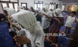 Jamaah Tarekat Naqsabandiyah Al Kholidiyah Jalaliyah berdoa saat melaksanakan sholat Idul Fitri di Masjid Rumah Suluk Darussalam, Cigombong, Kabupaten Bogor, Jawa Barat, Selasa (9/4/2024). Rumah Suluk Darussalam yang merupakan pusat Tarekat Naqsabandiyah se-Pulau Jawa tersebut menggelar sholat Idul Fitri 1 Syawal 1445 Hijriah berdasarkan hasil penghitungan pergantian bulan menggunakan metode hisab qomariah yang telah digunakan secara turun temurun. (FOTO : Republika/Putra M. Akbar)