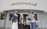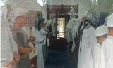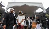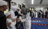 Jamaah Tarekat Naqsabandiyah Al Kholidiyah Jalaliyah bersalaman usai melaksanakan sholat Idul Fitri di Masjid Rumah Suluk Darussalam, Cigombong, Kabupaten Bogor, Jawa Barat, Selasa (9/4/2024). Rumah Suluk Darussalam yang merupakan pusat Tarekat Naqsabandiyah se-Pulau Jawa tersebut menggelar sholat Idul Fitri 1 Syawal 1445 Hijriah berdasarkan hasil penghitungan pergantian bulan menggunakan metode hisab qomariah yang telah digunakan secara turun temurun. (FOTO : Republika/Putra M. Akbar)