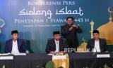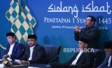 REPUBLIKA.CO.ID, JAKARTA. -- Menteri Agama Yaqut Cholil Qoumas didampingi Wakil Menteri Saiful Rahmat Dasuki dan Ketua Komisi VIII DPR Ashabul Kahfi mengumumkan hasil sidang isbat 1 Syawal 1445 Hijriah di Kantor Kementerian Agama, Jakarta, Selasa (9/4/2024).