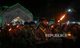 Abdi dalem Mangkunegaran membawa obor mengikuti Pawai Obor Takbir Keliling di kawasan Pura Mangkunegaran, Solo, Jawa Tengah, Selasa (9/4/2024). Pawai yang digelar abdi dalem dan pengurus Masjid Al-Wusto tersebut sebagai simbol kebersamaan sekaligus menyambut hari raya Idul Fitri 1445 H yang jatuh pada Rabu (10/4). (FOTO : ANTARA FOTO/Mohammad Ayudha)