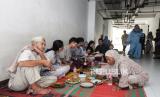 Sejumlah warga menyantap makanan bersama usai melaksanakan Sholat Idul Fitri 1445 Hijriah di Kampung Akuarium, Jakarta, Rabu (10/4/2024). Dalam rangka momen Idul Fitri 1445 Hijriah, warga Kampung Akuarium saling bersilaturahim dari unit ke unit untuk saling bermaafan, berbagi THR dan makan bersama. (FOTO : Republika/Putra M. Akbar)