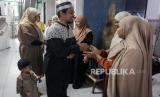 Sejumlah warga bersalaman usai melaksanakan Sholat Idul Fitri 1445 Hijriah di Kampung Akuarium, Jakarta, Rabu (10/4/2024). Dalam rangka momen Idul Fitri 1445 Hijriah, warga Kampung Akuarium saling bersilaturahim dari unit ke unit untuk saling bermaafan, berbagi THR dan makan bersama. (FOTO : Republika/Putra M. Akbar)