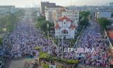 Foto udara sejumlah umat Islam menunaikan sholat Idul Fitri 1445 Hijriah secara berjamaah di Jalan Jatinegara Barat dan Jalan Matraman Raya, Jatinegara, Jakarta, Rabu (10/4/2024). Warga muslim setempat biasanya melaksanakan sholat Idul Fitri maupun Idul Adha di samping kanan dan kiri Gereja Protestan Koinonia yang didirikan pada 1889 itu. (FOTO : ANTARA FOTO/Aditya Pradana Putra)
