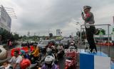 Petugas kepolisian mengurai kemacetan arus lalu lintas di Simpang Tiga Mengkreng, Kediri, Jawa Timur, Kamis (11/4/2024). Kepolisian setempat melakukan rekayasa lalu lintas dengan pengalihan kendaraan ke jalur alternatif untuk mengurai penumpukan kendaraan yang terjadi di titik pertemuan tiga kabupaten yakni Kediri, Jombang, dan Nganjuk itu. (FOTO : ANTARA FOTO/Muhammad Mada)