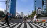 Warga menyeberang saat lalu lintas lengang di kawasan Bundaran HI, Jakarta, Kamis (11/4/2024). Sejumlah jalan protokol Jakarta lengang pada hari ke-2 Idul Fitri 1445 H. (FOTO : ANTARA FOTO/Muhammad Adimaja)