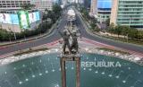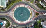 REPUBLIKA.CO.ID, JAKARTA -- Foto udara suasana lalu lintas di kawasan Bundaran HI, Jakarta, Kamis (11/4/2024). Sejumlah jalan protokol Jakarta lengang pada hari ke-2 Idul Fitri 1445 H.