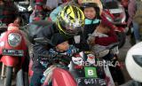 Pemudik bersepeda motor antre menunggu untuk menaiki kapal di Pelabuhan Bakauheni, Lampung Selatan, Lampung, Jumat (12/4/2024). Berdasarkan data Posko ASDP selama 12 jam, memasuki H+1 lebaran 2024, sebanyak 9.523 unit kendaraan menggunakan jasa angkutan kapal laut menyeberang ke Pulau Jawa. (FOTO : ANTARA FOTO/Ardiansyah)