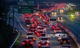 REPUBLIKA.CO.ID, SEMARANG. -- Kendaraan roda empat yang didominasi pemudik melaju perlahan di Jalan Tol Trans Jawa, Semarang-Solo Km 442 B, Bawen, Kabupaten Semarang, Jawa Tengah, Sabtu (13/4/2024).