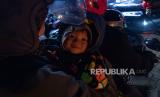 Pemudik dari Surakarta, Jawa Tengah tujuan Bekasi, Jawa Barat menggendong anaknya seusai beristirahat di pinggir jalan nasional Semarang-Solo, di wilayah Kecamatan Bergas, Kabupaten Semarang, Jawa Tengah, Sabtu (13/4/2024). Arus balik pada Sabtu (13/4) atau H+2 Lebaran dari arah Solo, DI Yogyakarta dan Jawa Timur yang akan menuju Jawa Tengah bagian barat, DKI Jakarta maupun Jawa Barat melalui jalur tersebut terpantau mulai dipadati pemudik bersepeda motor. (FOTO : ANTARA FOTO/Aji Styawan )