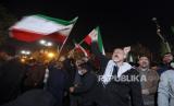 Warga Iran merayakan serangan drone Iran terhadap Israel di depan kedutaan Inggris di Teheran, Iran, Ahad (14/4/2024). Iran melancarkan serangan militer langsung pertamanya terhadap Israel pada hari Sabtu. Militer Israel mengatakan Iran menembakkan lebih dari 100 drone pembawa bom ke arah Israel. Beberapa jam kemudian, Iran mengumumkan bahwa mereka juga telah meluncurkan rudal balistik yang jauh lebih merusak. (FOTO : EPA-EFE/ABEDIN TAHERKENAREH)