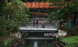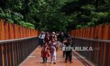 Sejumlah warga berjalan melewati jembatan saat berwisata di Tebet Eco Park, Tebet, Jakarta, Senin (15/4/2024). Taman kota menjadi destinasi wisata alternatif bagi warga untuk menghabiskan libur Lebaran 1445 Hijriah. Mudahnya akses menuju taman kota dan bebas tarif tanpa dipungut biaya masuk taman kota menjadi pilihan tepat bagi warga yang ingin berlibur ditengah tempat wisata lainnya yang dipenuhi oleh wisatawan. (FOTO : Republika/Putra M. Akbar)