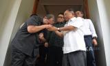 Pendeta Gilbert Lumoindong berjabat tangan dengan Ketua Umum Dewan Masjid Indonesia (DMI) Jusuf Kalla (JK) usai melakukan pertemuan di kediaman JK, Kebayoran Baru, Jakarta, Senin (15/4/2024). Dalam kesempatan tersebut Pendeta Gilbert meminta maaf kepada seluruh masyarakat Indonesia khususnya umat Islam atas kegaduhan yang terjadi akibat ceramahnya yang menyinggung soal salat dan zakat dalam Islam. Pendeta Gilbert menyebut video ceramahnya yang viral di media sosial dan menimbulkan kegaduhan ini telah dipotong-potong dan tidak memuat penjelasan yang lengkap. Ia pun menegaskan tak bermaksud untuk mengolok-olok umat Muslim melalui ceramahnya tersebut. (FOTO : Republika/Prayogi)