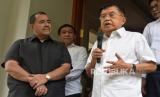 Ketua Umum Dewan Masjid Indonesia (DMI) Jusuf Kalla (JK) bersama Pendeta Gilbert Lumoindong menyampaikan keterangan kepada wartawan usai melakukan pertemuan di kediaman JK, Kebayoran Baru, Jakarta, Senin (15/4/2024). Dalam kesempatan tersebut Pendeta Gilbert meminta maaf kepada seluruh masyarakat Indonesia khususnya umat Islam atas kegaduhan yang terjadi akibat ceramahnya yang menyinggung soal salat dan zakat dalam Islam. Pendeta Gilbert menyebut video ceramahnya yang viral di media sosial dan menimbulkan kegaduhan ini telah dipotong-potong dan tidak memuat penjelasan yang lengkap. Ia pun menegaskan tak bermaksud untuk mengolok-olok umat Muslim melalui ceramahnya tersebut. (FOTO : Republika/Prayogi)
