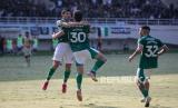 Pesepak bola PSS Sleman Ajak Kevin Gomes De Oliveira (tengah) berselebrasi bersama rekannya Esteban Gabriel Vizcarra (kiri) usai berhasil mencetak gol ke gawang Arema FC pada pertandingan BRI Liga I di Stadion Manahan, Solo, Jawa Tengah, Senin (15/4/2024). PSS Sleman menang atas Arema FC dengan skor 4-1. Gol PSS dicetak Ajak Riak di menit ke-16, Kevin Gomes menit ke-40, gol bunuh diri Julian Guevara menit ke-86, dan Saddam Gaffar menit 93. Arema hanya mampu mencetak satu gol lewat Charles Raphael de Almeida 30. (FOTO : ANTARA FOTO/Mohammad Ayudha)