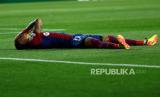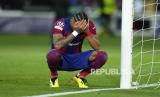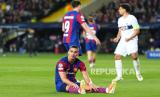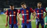 Reaksi pemain Barcelona usai timnya dikalahkan Paris Saint-Germain pada pertandingan sepak bola leg kedua perempat final Liga Champions di stadion Olimpic Lluis Companys di Barcelona, Spanyol, Rabu (17/4/2024). PSG sukses menaklukkan Barca dengan skor 4-1. Gol PSG dicetak Ousmane Dembele di menit ke-40, Vitor Ferreira menit ke-54 dan Kylian Mbappe menit ke-61 dan 89. Satu gol Barcelona Dicetak Raphinha di menit ke-12. Dengan hasil ini PSG melaju ke babak semifinal Liga Champions dengan agregat 6-4. (FOTO : AP Photo/Joan Monfort)