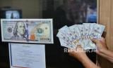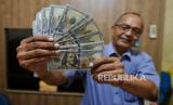 Petugas menunjukan uang dollar AS di Money Changer, Jakarta, Rabu (17/4/2024). Berdasarkan data Bloomberg Rabu (17/4) pukul 12:00 WIB rupiah anjlok ke Ro16.236 per dolar AS melemah 60,50 poin atau 0,37 persen. Pelamahan nilai tukar rupiah terhadap dolar AS tersebut imbas dari ketegangan geopolitik di kawasan Timur Tengah antara Iran dan Israel. (FOTO : Republika/Thoudy Badai)