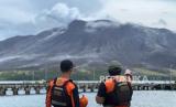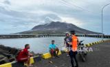 REPUBLIKA.CO.ID, SULUT -- Personel Basarnas (Badan SAR Nasional) mengamati gunung Ruang dari dermaga pelabuhan Tagulandang, Kabupaten Kepulauan Sitaro (Siau, Tagulandang, Biaro), Sulawesi Utara, Kamis (18/4/2024).