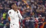 Reaksi Rafael Leao dari AC Milan saat perempat final Liga Eropa UEFA, pertandingan sepak bola leg kedua antara AS Roma dan AC Milan di Roma, Italia, Jumat (19/4/2024) dini hari WIB. (FOTO : EPA-EFE/FABIO FRUSTACI)