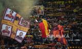 Suporter Roma bersorak untuk timnya jelang dimulainya pertandingan sepak bola leg kedua perempat final Liga Europa antara Roma dan AC Milan, di Stadion Olimpiade Roma, Jumat (19/4/2024) dini hari WIB. (FOTO : AP Photo/Andrew Medichini)