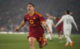 Paulo Dybala dari Roma, kanan, mencetak gol keduanya pada pertandingan sepak bola leg kedua perempat final Liga Europa antara Roma dan AC Milan di Stadion Olimpiade Roma, Jumat (19/4/2024) dini hari WIB. (FOTO : Fabrizio Corradetti/LaPresse via AP)